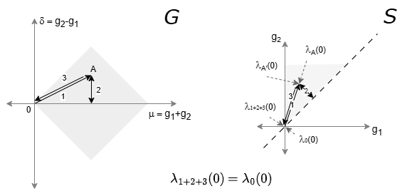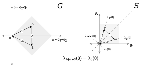 \[\lambda_{(\mu, \delta)}(x_1, x_2) = \frac{1}{2}\left[(\mu-\delta+x_1) \mathbf{e}\\_1 + (\mu+\delta+x_2) \mathbf{e}\\_2\right]\]This map parametrizes actions as parallel motions (controlled by $\mu$)git and contrary motions (controlled by $\delta$). In terms of the previous real pitch pair definition, $\mu = g_1 + g_2$ and $\delta = g_2 - g_1$. The figure below shows the group actions and thier effect on pitch space. The figure also illustrates how group operations results in the composition of transformation in the pitch space. In particular, the example illustrates the composition rule resulting of group actions, namely that any trajectory that starts and ends at the same group element (here the identity) must also start and end at the same pitch pair (in this case the standard pitch pair).